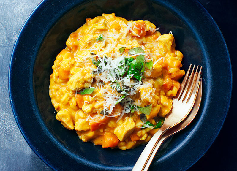 Dyniowo-kurczakowe risotto to aromatyczne danie, w którym klasyczne włoskie risotto wzbogacone jest o dynię i mięso kurczaka. Dynia dodaje lekkości i delikatnego słodkiego smaku, który doskonale komponuje się z przyprawami i bulionem. Natomiast kurczak nadaje potrawie białkowej wartości, tworząc pożywną i smaczną kompozycję. To idealna propozycja na jesienne wieczory, które rozgrzeją i sycą zarówno podczas przygotowania, jak i podczas spożywania.