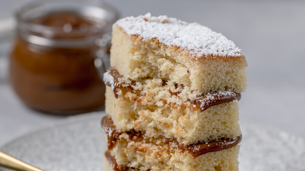- Nałóż na każdy placek nadzienie z gotowanego, skondensowanego mleka.