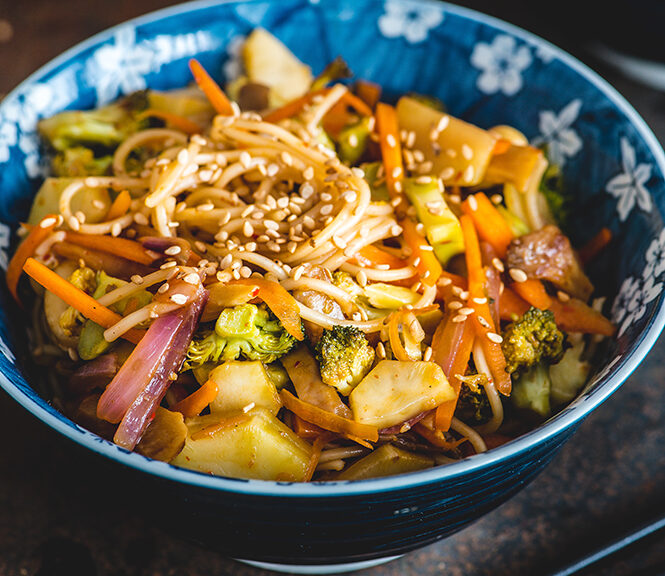 - Podsmaż warzywa na patelni z odrobiną oleju sezamowego.