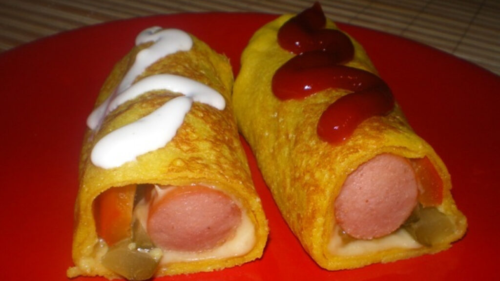 - Gotowe naleśniki z parówką, serem i ogórkiem podawaj gorące.