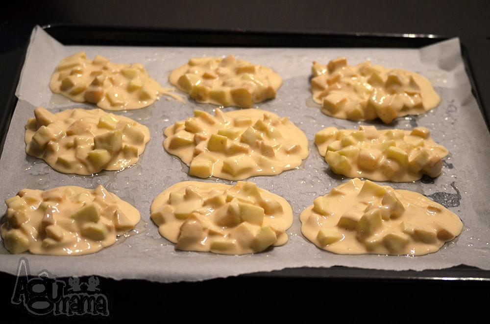 - Za pomocą łyżki nakładaj porcje ciasta na blachę, formując placki.