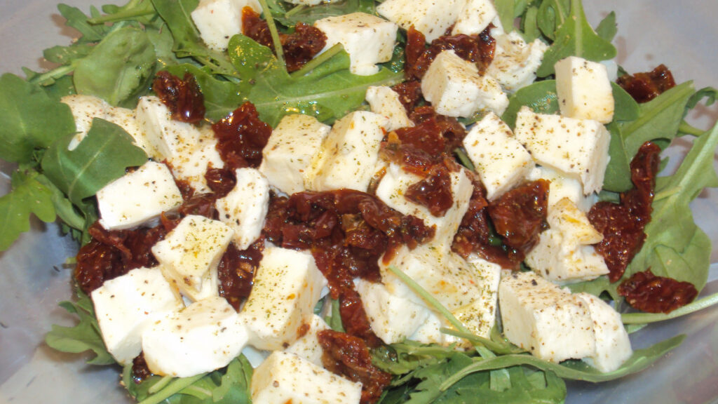 Sałatka z rukolą, suszonymi pomidorami i mozzarellą to szybki i prosty przepis, który połączy intensywny smak rukoli z słodyczą suszonych pomidorów i kremową mozzarellą. Idealnie nadaje się jako lekki posiłek lub zdrowa przekąska. Dodatek oliwy z oliwek i octu balsamicznego podkreśli smaki składników, tworząc wyśmienite połączenie.