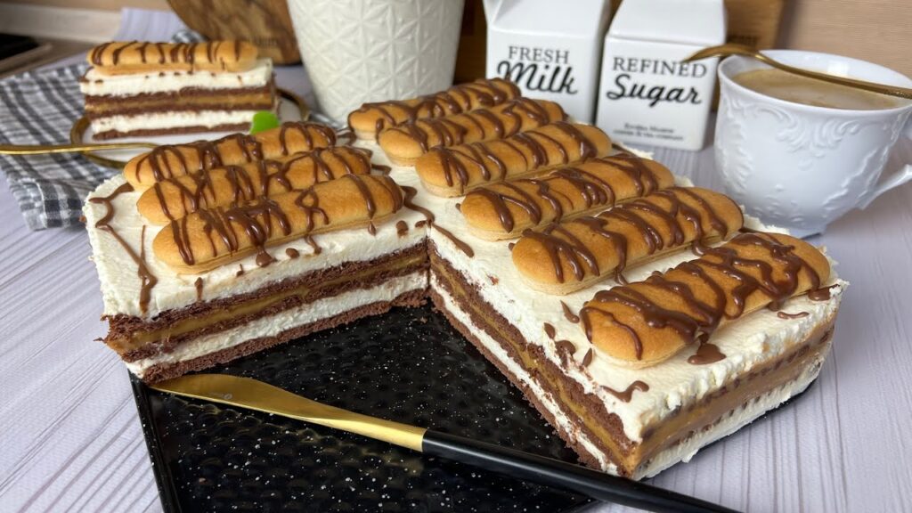 - Zamocz 10 biszkoptów w mleku i ułóż je na wierzchu ciasta.