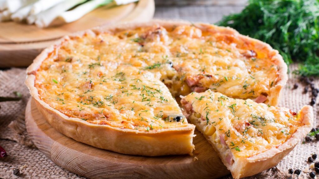 - Wstaw tartę do nagrzanego piekarnika i piecz przez określony czas, aż masa jajeczna się zetnie i ciasto będzie złocisto-brązowe.