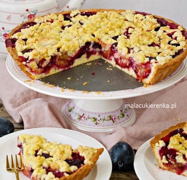 - Podawaj tartę ze śliwkami i kruszonką na ciepło lub letnio, najlepiej posypaną delikatnie cukrem pudrem
