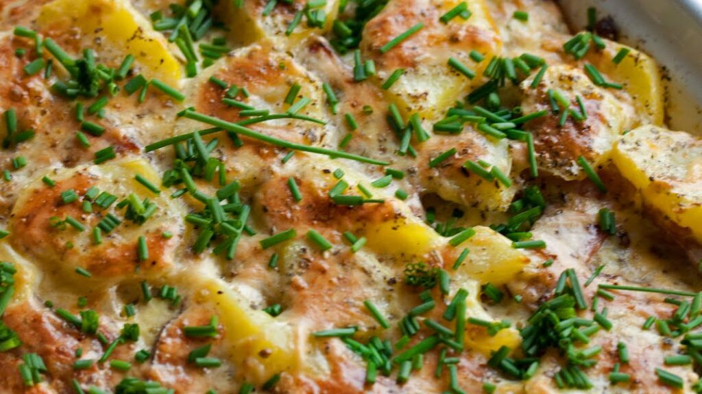 - W naczyniu żaroodpornym układamy warstwę ziemniaków, posypujemy je częścią szynki, polewamy sosem, powtarzamy warstwy, aż skończą się składniki.