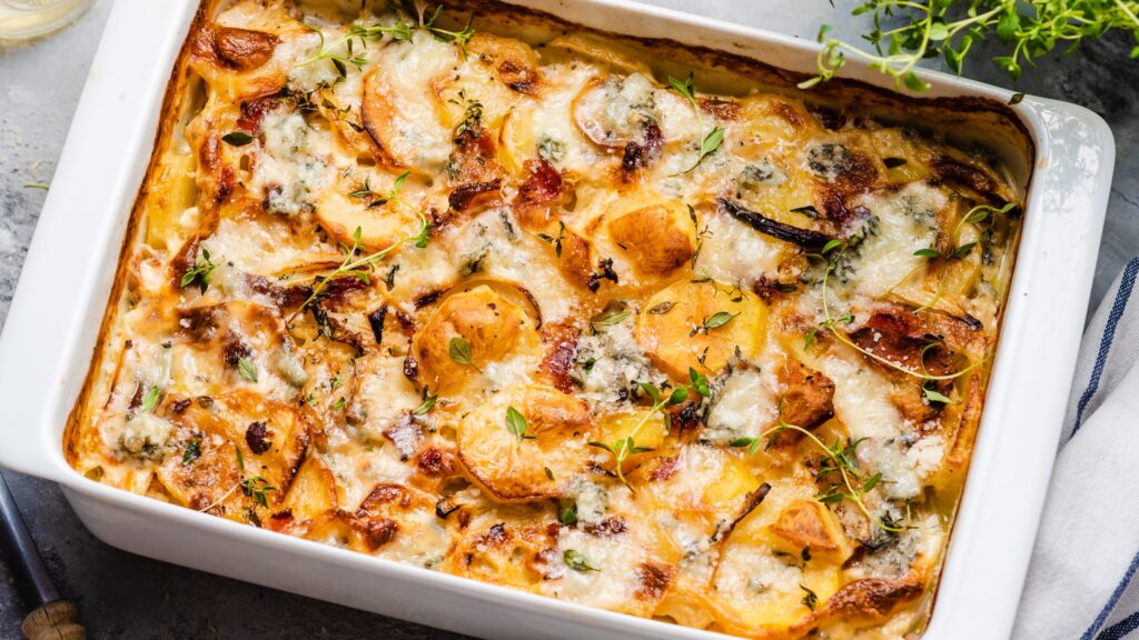 - Wstaw formę do piekarnika i zapiekaj, aż ser się roztopi i ziemniaki będą miękkie (czas pieczenia zależny od temperatury piekarnika).